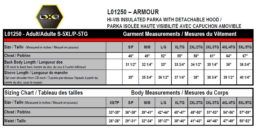 215 gsm – 6.3 oz./yd2 – 10.5 oz./lin. yd 100% polyester oxford 3000 mm waterproof rating, 3000 gsm breathability rating, wind resistant and water repellent finish. Insulation: 220 gsm body, 170 gsm sleeves 100% polyester.  Heavy duty polyester canvas with taped waterproof seams & breathable finish. Full body thermal quilted insulation. Detachable thermal lined hood.  YKK zipper on front fly with storm flap. Hidden front dome snaps for safety.  Oversize patch pockets with flap. Inner zipper pocket. Drawcord on hem for greater mobility & comfort. Adjustable tab closure on cuffs. Brushed tricot pocket lining. Rib knit storm cuff for extra protection. 4” hi-vis contrast band with 2” 3M reflective tape on front and back body and sleeves.  Meets CSA standards